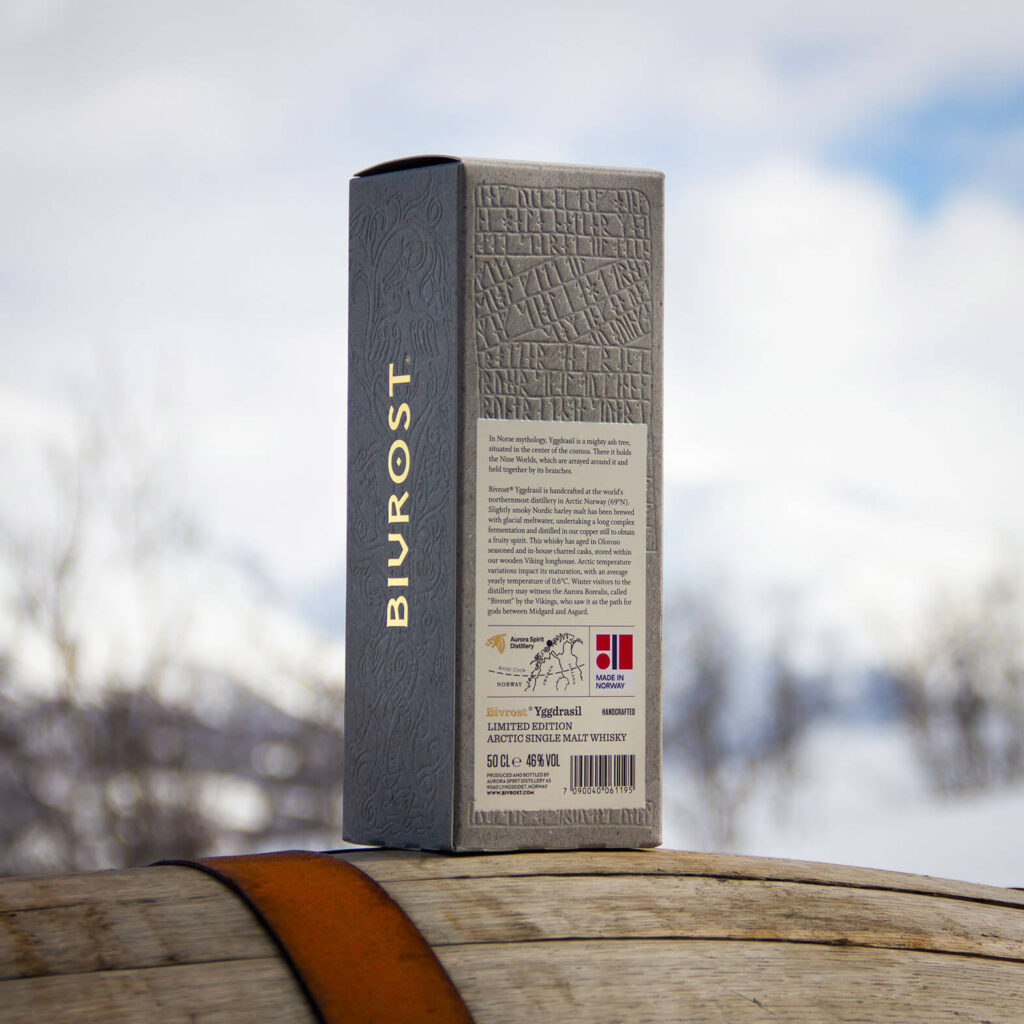 Bivrost® Yggdrasil je naše první core arktická single malt whisky, která si zaslouží jen to nejlepší. Nápisy na krabici vyprávějí současný příběh o Yggdrasilu a jsou vyvedeny ve skutečném runovém písmu zvaném mladší futhark.